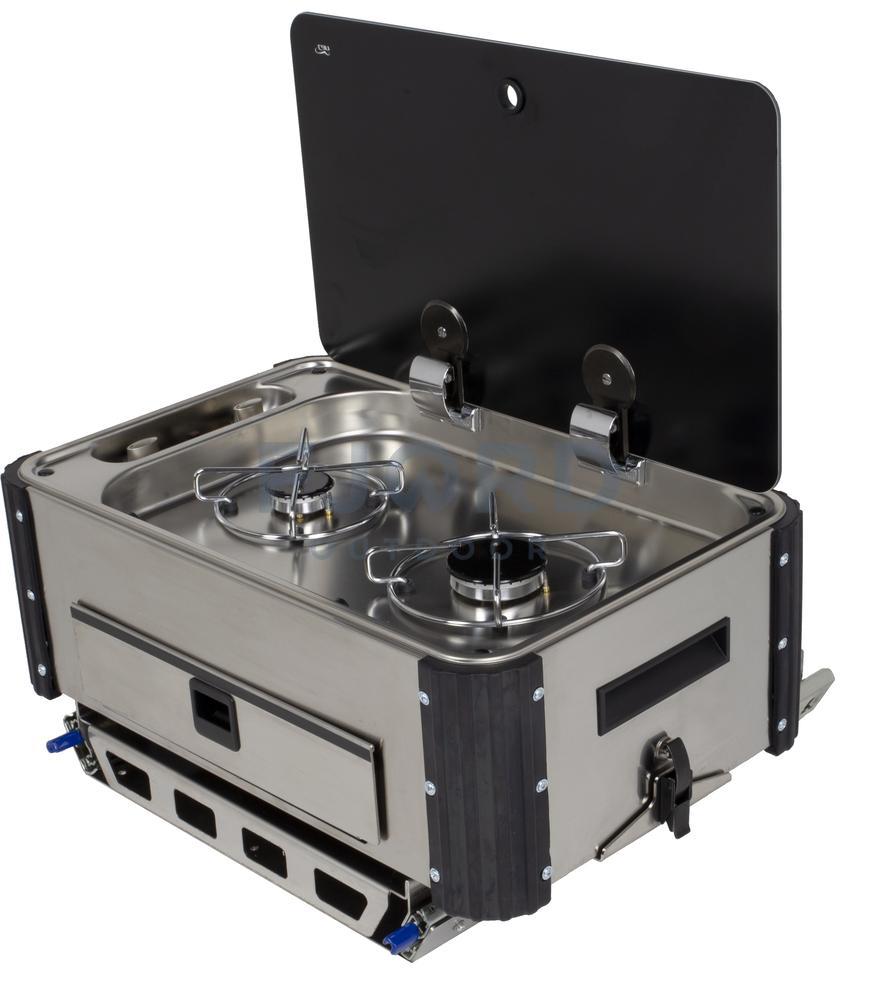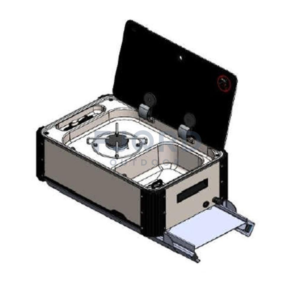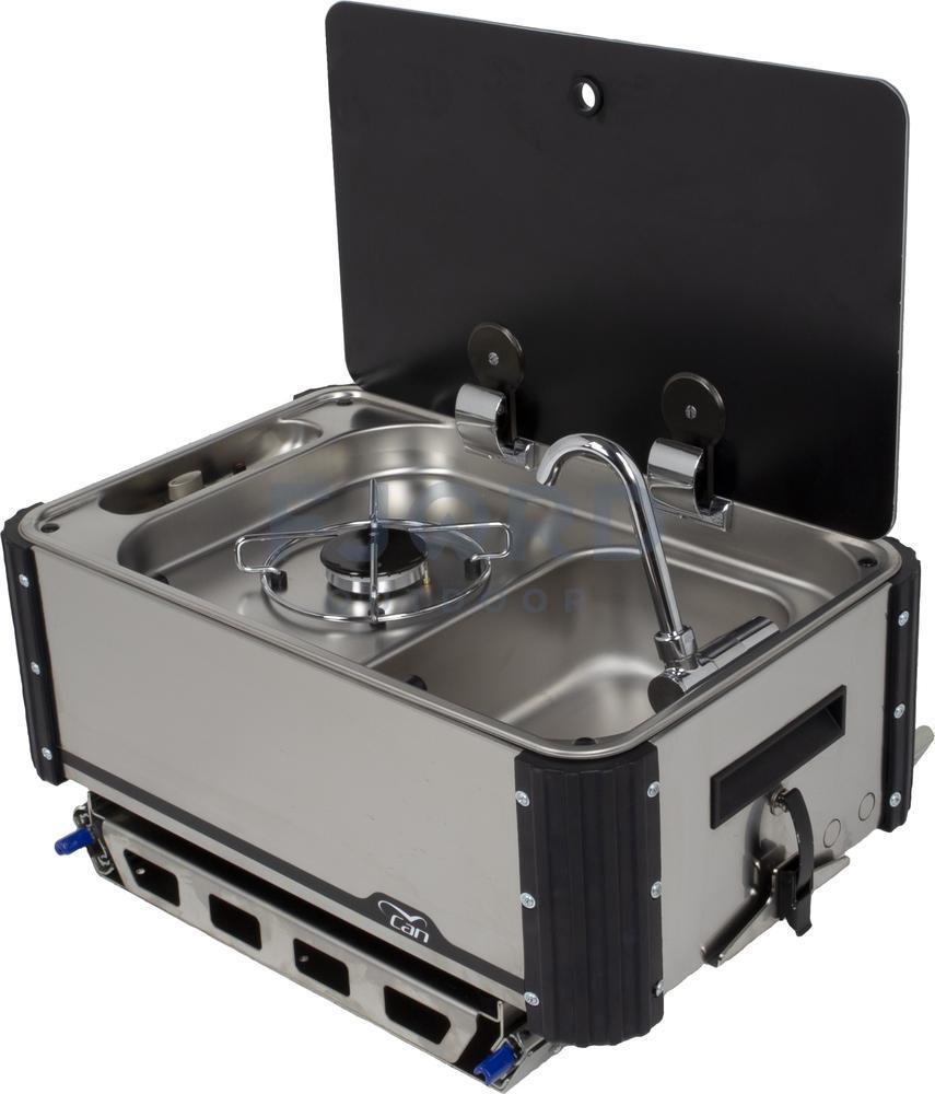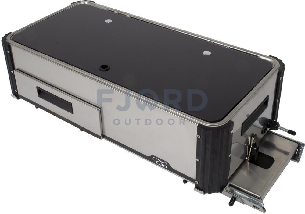 De CAN Keuken kan je uit een serviceluik of garage schuiven zodat je makkelijk kan buiten koken. Er zijn 2 uitvoeringen een korte deze komt in de breedte eruit over de smalle kant van de keuken. De lange uitvoering komt in de lengte over de brede kant van de keuken uit de bak.