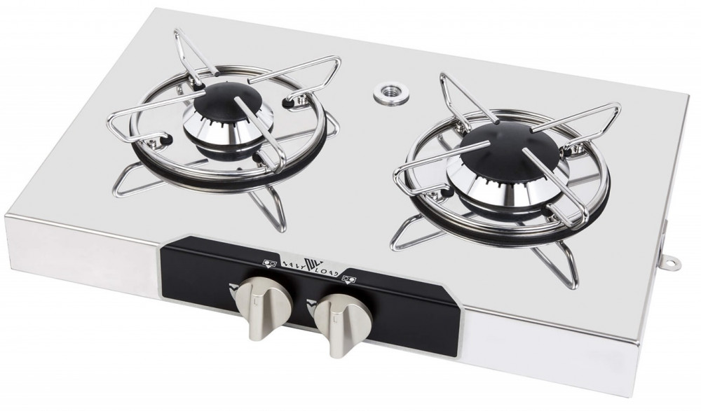 RVS vrijstaande kookplaat uitgerust met 2 branders. Ideaal voor montage in een caravan, camper, boot of buitenkeuken.
