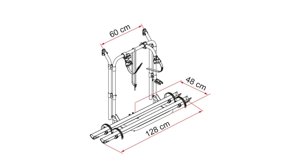 Deze fietsendrager wordt op de rechterdeur gemonteerd en laat de linkerdeur vrij voor de eventuele installatie van een Deluxe-ladder om toegang te krijgen tot het dak van het voertuig. Geschikt voor busjes met dubbele achterdeuren. Het wandframe is in hoogte verstelbaar van 58 tot 62cm. De boven bevestigingsbeugels zijn slechts 34mm breed.